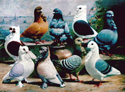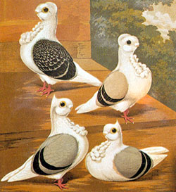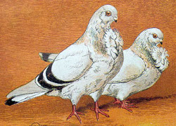 | Een belangrijk kenmerk van de Meeuw is toch wel het karakter. Dit is ook alle duivenauteurs in de loop der tijden steeds weer opgevallen. Ook onze grote duivenkenner wijlen Spruijt leidde in zijn boek "De Structuurduiven" de meeuw in via het karakter. Hij schreef: "door hun vertrouwelijkheid, hunne elegante bewegingen, hun prettige wijze van voordoen, hun gehele persoonlijkheid, een ieder voor zich innemen en een bewonderaar voor zich maken". Een volzin en stellig een reactie vol van enig menselijk geluksgevoel, ontstaan door de gedragingen - het karakter - der "meeuwtjes" van iemand die meer dan wie ook, alle duivenkarakters heeft ervaren. | ![]() Een koppel blauwe Owls van het oude type, geschilderd door Harrison Weir |